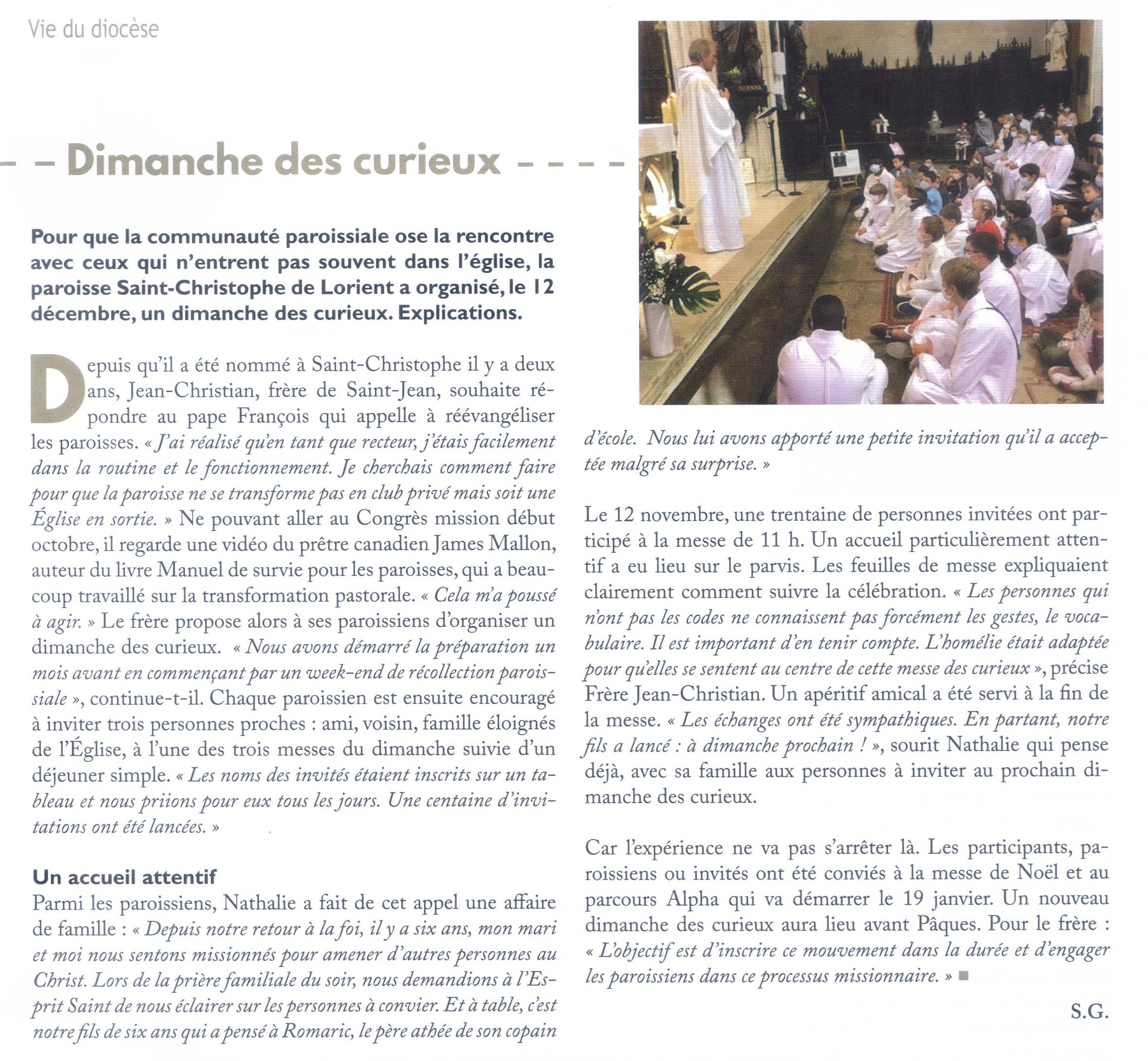 Chaque paroissien pouvait inviter ses « curieux », c’est-à-dire des gens de son entourage qui ne connaissent pas spécialement la foi et la pratique mais ne sont pas opposés à venir voir. Belle réussite car une trentaine de personnes sont venues de cette façon. Toute la Communauté paroissiale a porté dans la prière cet événement lancé par le recteur, frère Jean-Christian ; un accueil particulier a été fait pour les curieux et dans cet élan missionnaire ils ont été invités à poursuivre leur chemin avec le Parcours Alpha par exemple qui suivra entre janvier et avril 2022.