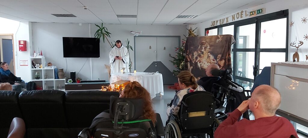 A Noël pour donner la communion, ne sachant pas si Cindy* (hémiplégique) pouvait déglutir, je l’entends dire avec humour : « J’Peux pas faire grand chose… mais J’Peux communier ».